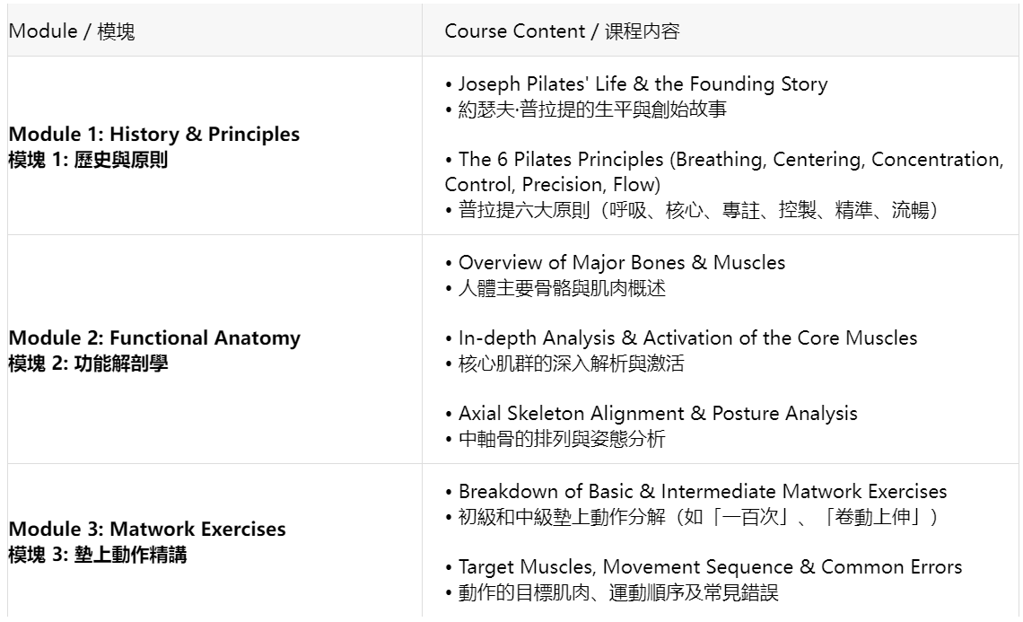 面向希望將經典普拉提原則融入教學實踐的運動專業人士的基礎認證。本課程提供安全有效地指導初級至中級普拉提墊上動作所需的基礎知識與實操技能。